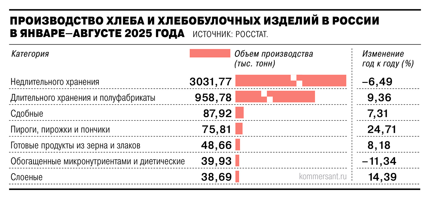 Массовое открытие в рознице точек хлебопечения и развитие самостоятельных пекарен при этом способствуют росту рынка полуфабрикатов. Из данных Росстата видно, что в январе—августе было произведено 328,3 тыс. тонн замороженных хлебобулочных изделий. Год к году значение выросло на 16%. Производство продукции краткосрочного хранения одновременно снизилось на 6,05%, до 3,03 млн тонн.