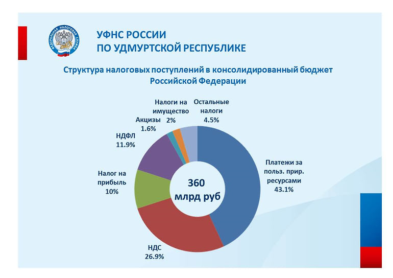 Консолидированный бюджет РФ (360 млрд руб.) в первую очередь пополнили за счет платежей за пользование природными ресурсами и НДС — 43,1 (155 млрд руб.) и 26,9% (97 млрд руб.). Основные поступления обеспечены предприятиями по добыче полезных ископаемых (182 млрд руб., или 55,5%), обрабатывающими производствами (93,8 млрд руб., или 93,8 млрд руб.) и организациями оптовой и розничной торговли, а также компаниями по ремонту транспорта (26,1 млрд руб., или 7,2%)
