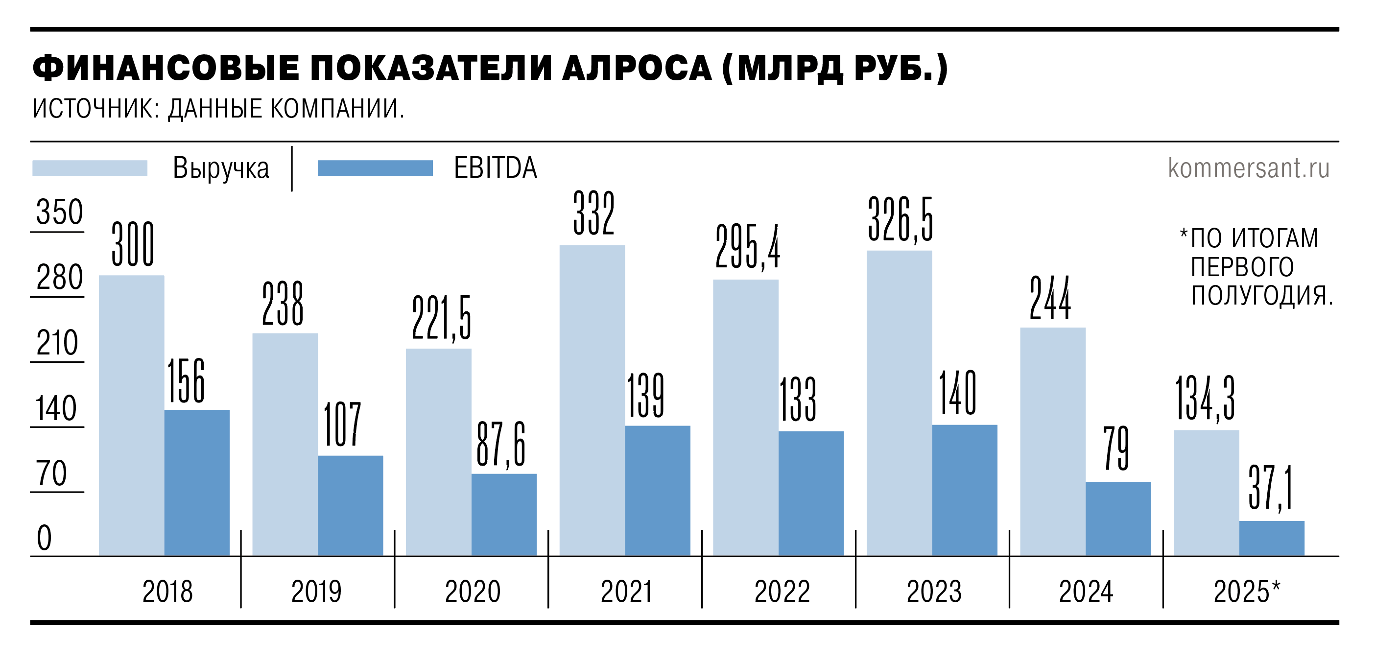 АЛРОСА, добывающая более 90% алмазов в РФ, отмечала, что в первой половине 2025 года алмазно-бриллиантовая отрасль была под давлением геополитической и макроэкономической неопределенности, снижения спроса на ювелирные украшения и значительных запасов бриллиантов в гранильном секторе. Выручка АЛРОСА за полугодие упала на 25% год к году, до 134,25 млрд руб., EBITDA снизилась на 42%, до 37,1 млрд руб., чистая прибыль выросла на 11%, до 40,6 млрд руб.