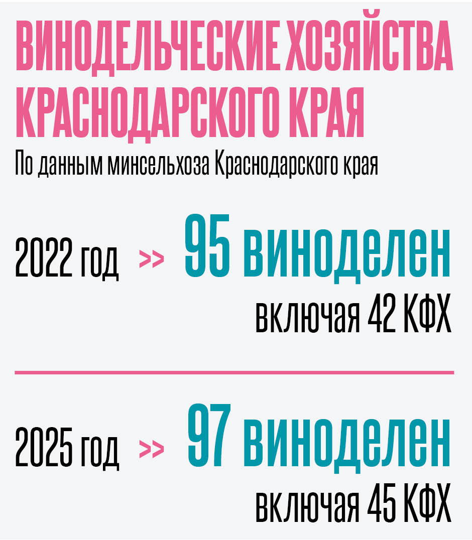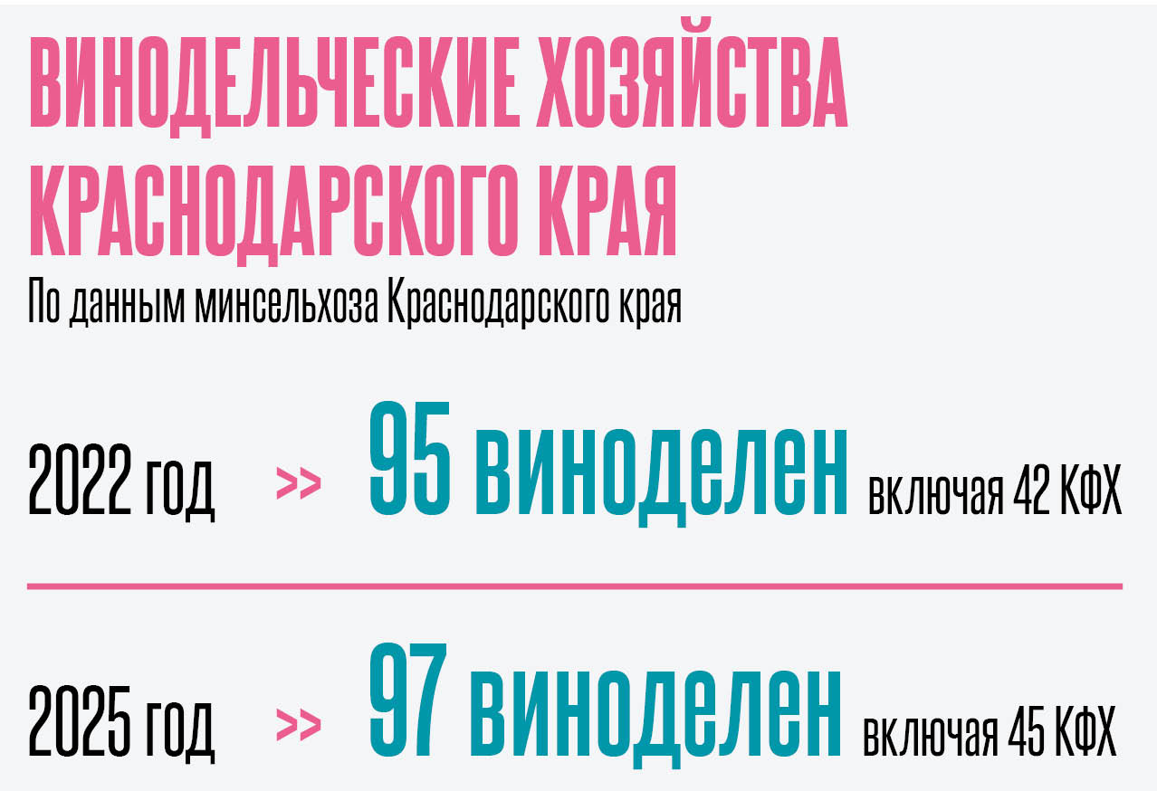 По данным министерства сельского хозяйства и перерабатывающей промышленности Краснодарского края, в регионе виноградарством и виноделием занимаются 329 организаций и крестьянских фермерских хозяйств, из них 96 — производством напитков. Общая площадь виноградников составляет 33 тыс. га. «Ежегодно винодельческим предприятиям не хватает около 50 тыс. т винограда для использования своей производственной мощности на 100%. Учитывая, что средняя урожайность винограда 100 ц/га, не хватает 5 тыс. га»,— отмечают в ведомстве.