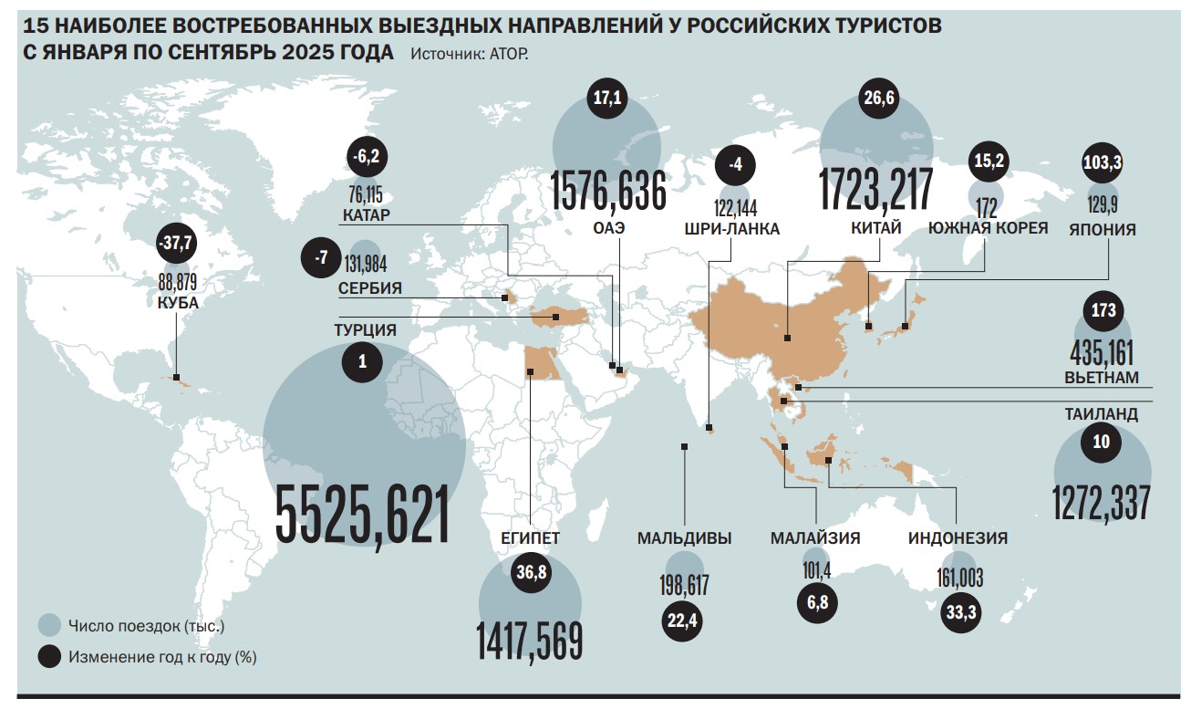 С января по сентябрь 2025 года граждане России совершили 14,8 млн путешествий в страны дальнего зарубежья, следует из отчетов Ассоциации туроператоров России (АТОР), составленных на базе данных Погранслужбы ФСБ.