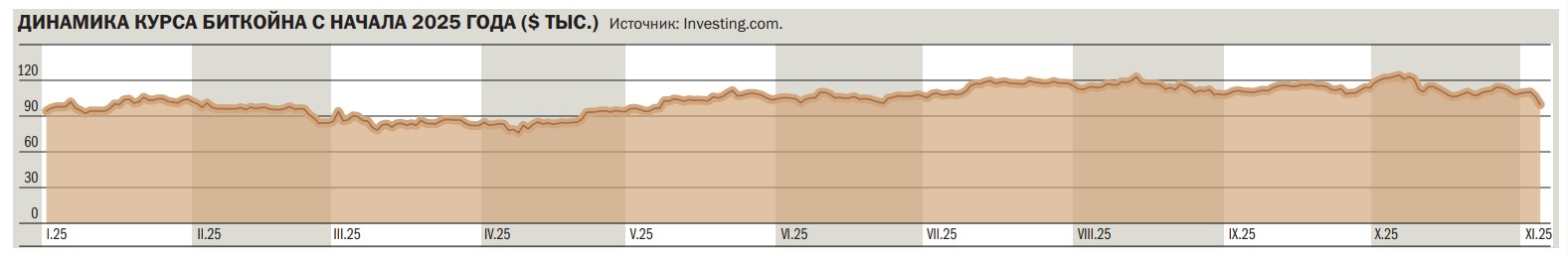 В начале ноября курс самой популярной цифровой валюты — биткойна — после четырехмесячного перерыва опустился ниже $100 тыс. За четыре недели он потерял почти 21%. Игру на понижение спровоцировали спекулянты, решившие зафиксировать прибыль после роста в начале осени. К ним присоединились более консервативные инвесторы, обеспокоенные рисками сохранения долларовых ставок на текущем уровне. Финансисты рассчитывают, что к концу года на традиционном «новогоднем ралли» рост курса биткойна возобновится и он превысит $120 тыс.