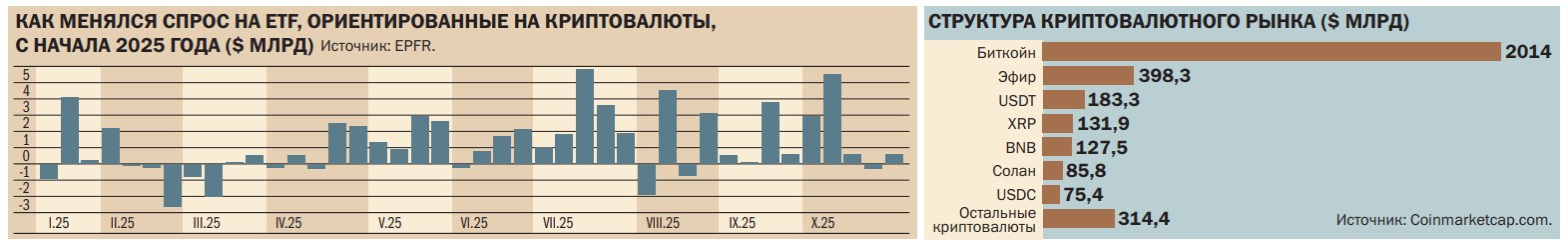 В конце месяца к спекулятивным факторам добавились и фундаментальные: ужесточение риторики ФРС США. 29 октября американский финансовый регулятор снизил ставку на 25 базисных пунктов (б. п.), до 3,75–4%. На пресс-конференции глава ФРС Джером Пауэлл заявил, что снижение ставки в декабре не предопределено и будет зависеть от ситуации на рынке. Эти сигналы, по мнению ведущего аналитика Bitget Research Райана Ли, усилили осторожность инвесторов и привели к фиксации прибыли. В результате в октябре был зафиксирован четвертый по величине за всю историю объем продаж биткойна — более $40 млрд. «Ранее такие объемы наблюдались только на локальных пиках рынка, но сейчас эйфории нет. Продажи идут, вероятно, от крупных структур, восстанавливающих баланс после убытков»,— полагает Александр Крайко.