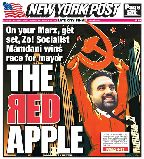 Газета New York Post посвятила обложку Зохрану Мамдани, который считается фаворитом на выборах мэра Нью-Йорка. Политик изображен в красном костюме: он держит в руках серп и молот, позади — небоскребы и красные звезды.