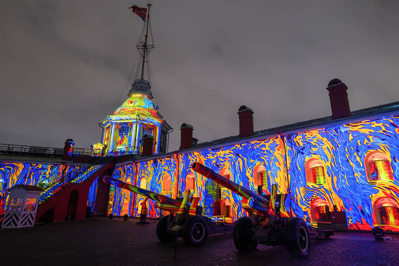 Петербуржцы и гости города наблюдали за красочными инсталляциями. На фасадах зданий оживали картины известных художников, строки литературных произведений и музыкальные образы.