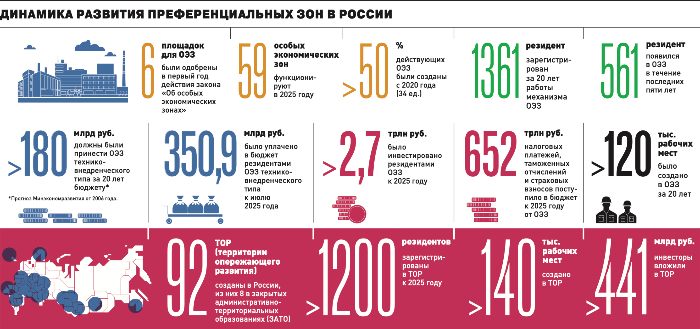 Два десятка лет спустя в России создано 59 особых экономических зон, причем более половины (34) — с 2020 года. Только в 2025 году открылись шесть новых ОЭЗ (в Новосибирской, Московской, Вологодской, Челябинской и Кемеровской областях, а также в Татарстане), еще пять — расширены. За 20 лет на площадках зарегистрирован 1361 резидент (из них 561 компания также пришла в течение последних пяти лет), создано более 100 тыс. рабочих мест, причем уровень зарплат там зачастую выше среднего по регионам на 30–50%. Что касается вклада технико-внедренческих ОЭЗ, то он превзошел прогнозы почти вдвое — к июлю 2025 года он составил 350,9 млрд руб. Инвестиции в ОЭЗ за это время достигли 2,7 трлн руб.