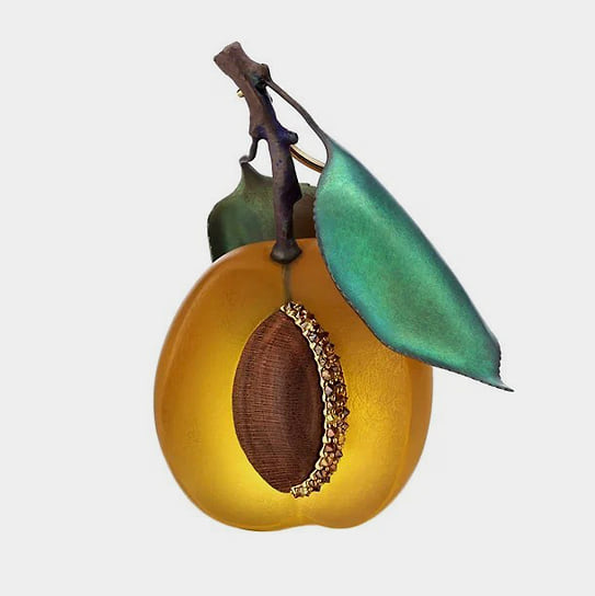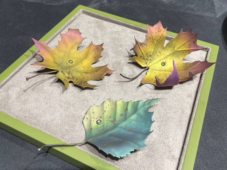 Броши — одно из любимых дизайнерских украшений Владимира Маркина. Многие свои авторские задумки Маркин воплотил в брошах: брошь-абрикос из янтаря, брошь-гранат с кожурой из алюминия и зернышками из резного кварцита, брошь-стручок с фасолинами из яшмы. Каждую осень из его мастерской выходят броши в виде осенних листьев из анодированного титана. «Брошь — это универсальный носибельный объект, в котором всегда заключен символ, настроение или знак отличия. Чтобы брошь получилась удачной, необходимы цвет, идея, посыл — вместе или по отдельности»,— говорит Маркин.— Самое сложное в ее дизайне и конструкции — выбрать идею и вовремя остановиться. После этого хочется как можно скорее перевести ее в материал«.