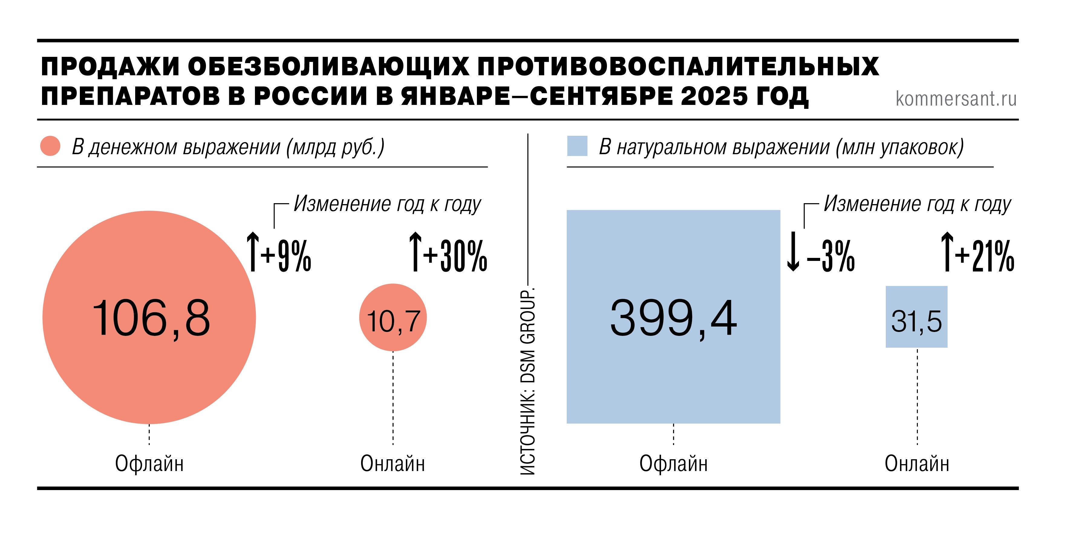 За девять месяцев 2025 года российские потребители потратили на обезболивающие средства на 11% больше год к году, или более 117 млрд руб. Самые большие темпы роста продаж таких лекарств — на 21% — наблюдаются в онлайне. С анальгетиков, в частности привычного парацетамола, покупатели все чаще переходят на противовоспалительные препараты более широкого действия, включая «Нурофен» и «Нимесил».