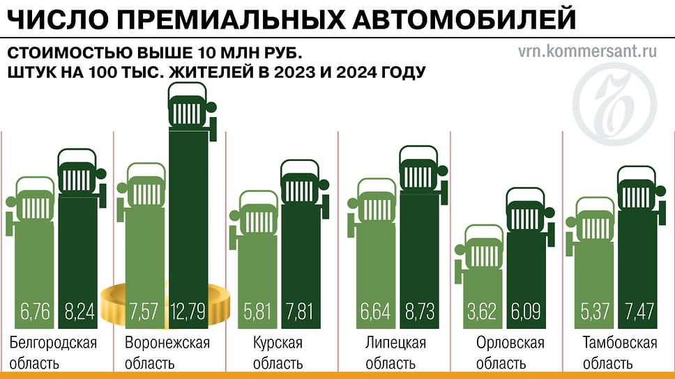 По итогам 2024 года среди регионов Черноземья наиболее заметно количество премиальных автомобилей стоимостью выше 10 млн руб. выросло в Воронежской области — на 69%, со 171 машины годом ранее до 289. При этом ни одна из областей макрорегиона не попала в федеральный топ-10 по данному показателю. Это следует из результатов исследования аналитической службы аудиторско-консалтинговой сети FinExpertiza, основанных на данных ФНС. Сумма начисленных налогов на премиальные авто воронежцев выросла в прошлом году на 46,5% — с 29,9 млн до 43,8 млн руб.