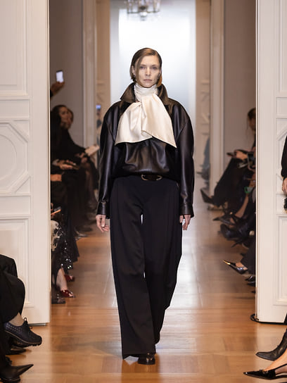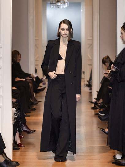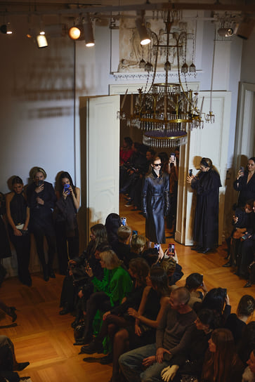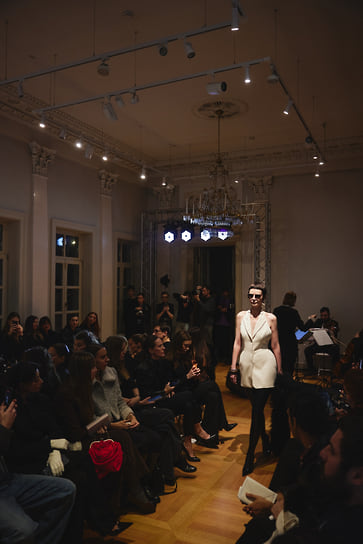 Концепция фешен-шоу была построена на живой интерпретации «Писем незнакомке» Андре Моруа. Женщина-перформер в черном жакете YULIAWAVE писала на каждом листе слова — pause (пауза), remember (помни), erase (сотри), stay (останься), breathe (дыши). Ассистенты брали листья, уносили их от стола и крепили на стену, создавая «комнату письма». Это была визуальная метафора создания чего-то нового: женщина как текст, который она переписывает бесконечно. Модели в черно-белой гамме, с акцентами туши, серого и телесного, двигались, как фразы в этом тексте. И в финале — как точка и восклицание — зрителям представили новогоднюю капсулу, официальный запуск которой намечен на 11 ноября, в 11:11.