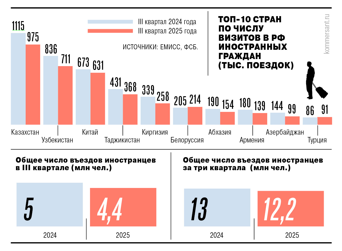 В третьем квартале нынешнего года зафиксировано около 4,4 млн визитов иностранных граждан в Россию — на 600 тыс. меньше аналогичного периода 2024 года. Такие данные “Ъ” обнаружил в статистике погранслужбы ФСБ. Всего за три квартала зарубежные граждане (в основном из Казахстана, Узбекистана и Китая) совершили 12,2 млн поездок в РФ, что почти на 1 млн меньше прошлогодних показателей. На въездной поток могли повлиять как ужесточение миграционной политики, так и международная конкуренция за иностранную рабочую силу, полагает эксперт.