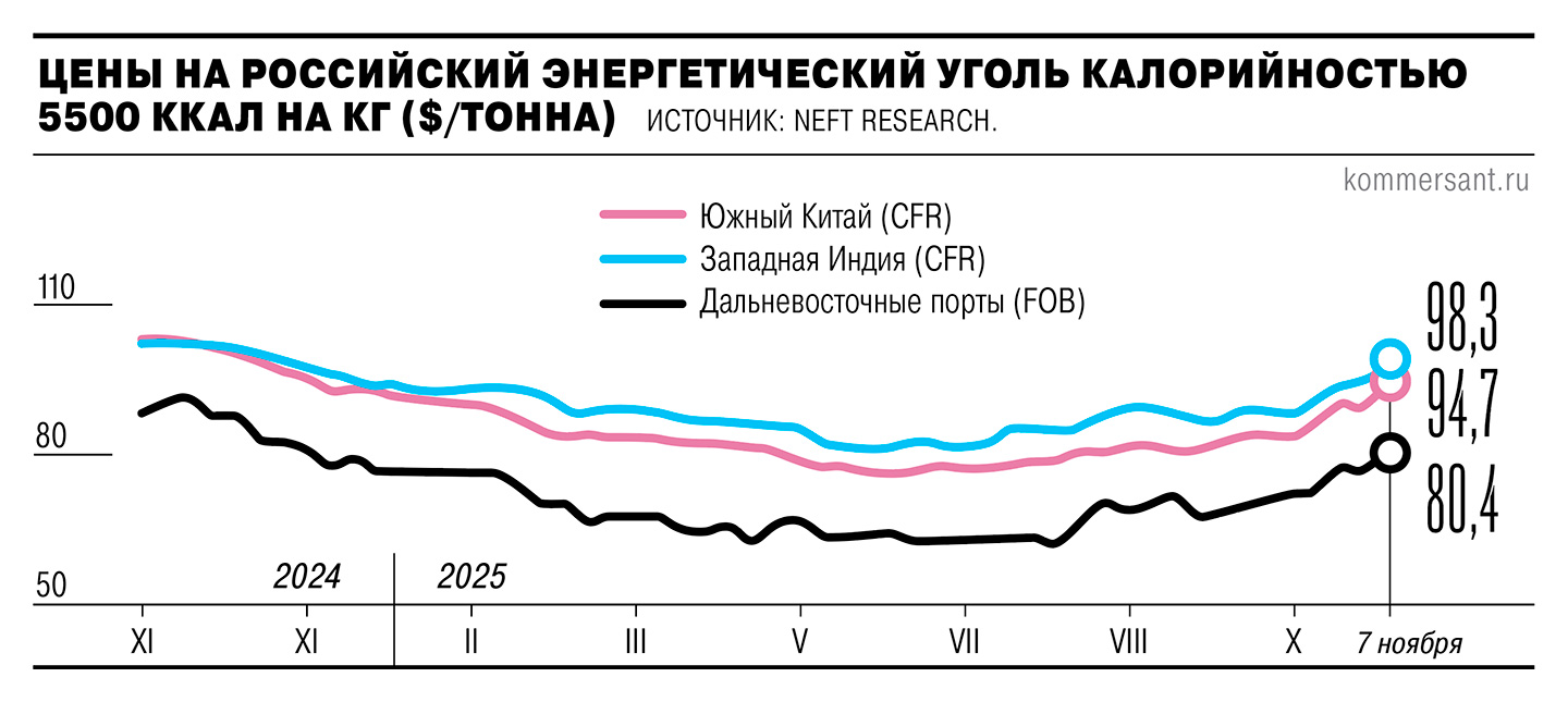 «Дополнительную поддержку оказывает ожидание ограниченного роста добычи: в провинции Шэньси ужесточены экологические проверки, а власти Внутренней Монголии предупредили о санкциях для шахт, превышающих утвержденные объемы производства»,— говорится в обзоре. По данным NEFT Research, котировки российского энергетического угля калорийностью 5500 ккал в портах Дальнего Востока к 7 ноября выросли на 4,5% неделя к неделе, до $80,4 за тонну (FOB). Рентабельность внешних поставок угля за счет укрепления цен на этом базисе увеличилась на 11,9–17,5%, до 2,24–2,78 тыс. руб. с тонны, в зависимости от калорийности, подсчитали аналитики.