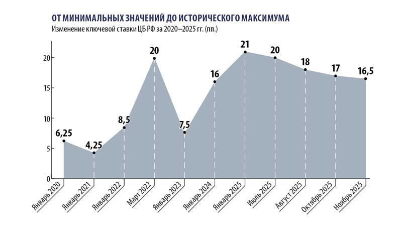 Центробанк продолжает проводить жесткую денежно-кредитную политику, пытаясь сдержать рост цен. Год назад ключевая ставка обновила исторический максимум, достигнув 21 % при инфляции ниже 10%, что означало двузначную реальную ставку — крайне высокий уровень для экономики. Сейчас ставка снизилась до 16,5 %, но даже при этом текущая инфляция в 8 % продолжает создавать напряженные условия как для бизнеса, так и для потребителей. При этом, по оценкам регулятора, инфляция замедляется недостаточно быстро и давление на цены сохраняется.