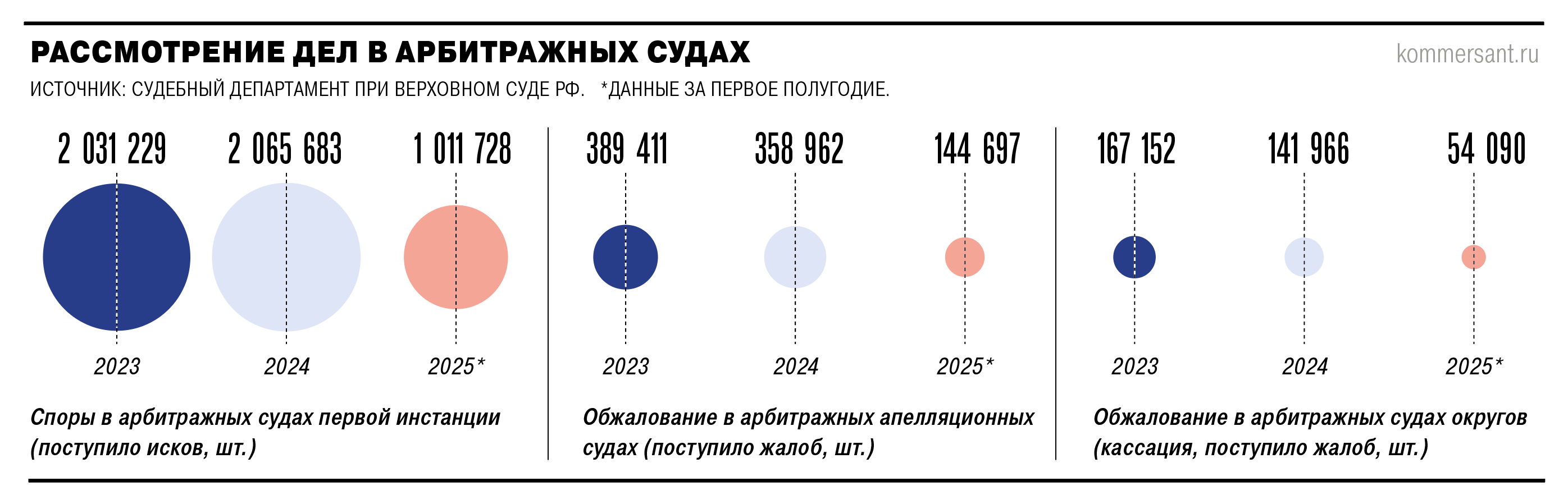 Отметим, что после увеличения госпошлин не произошло падения числа обращений в арбитражные суды первой инстанции, то есть снижения количества исков, следует из статистики судебного департамента при ВС за первую половину 2025 года. Уменьшение активности участников бизнес-споров заметно только на этапах обжалования судебных решений в вышестоящих инстанциях (подробнее об этом — в колонке).