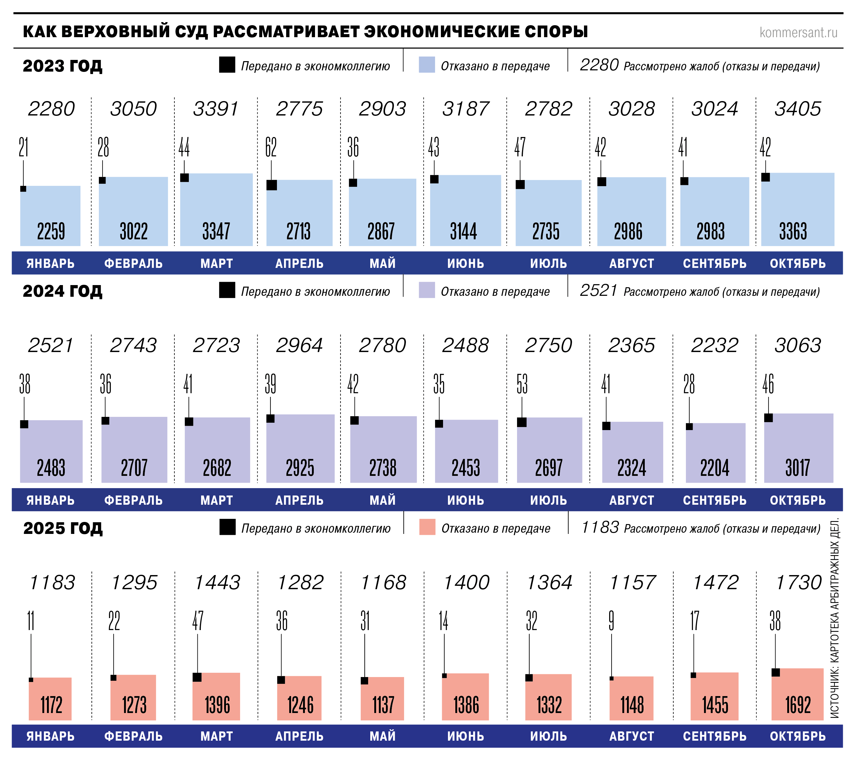 Подробно о данных за первое полугодие 2025-го “Ъ” писал 2 июля. Анализ же периода с июля по октябрь показывает резкие колебания в отдельные месяцы. В частности, в июле 2025 года произошел существенный скачок в доле переданных в коллегию экономических споров — до 2,35%, тогда как в том же месяце 2024 года она составляла 1,9%, а годом ранее не дотягивала до 1,7%. Если говорить об абсолютных цифрах, при двукратном уменьшении числа жалоб количество передач в коллегию в июле снизилось меньше — лишь на 40% к 2024-му и на 32% к 2023 году.