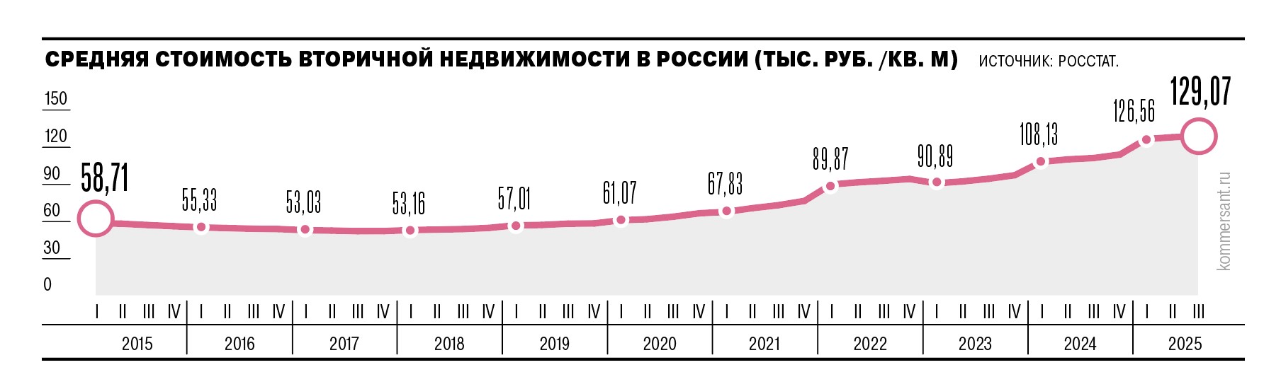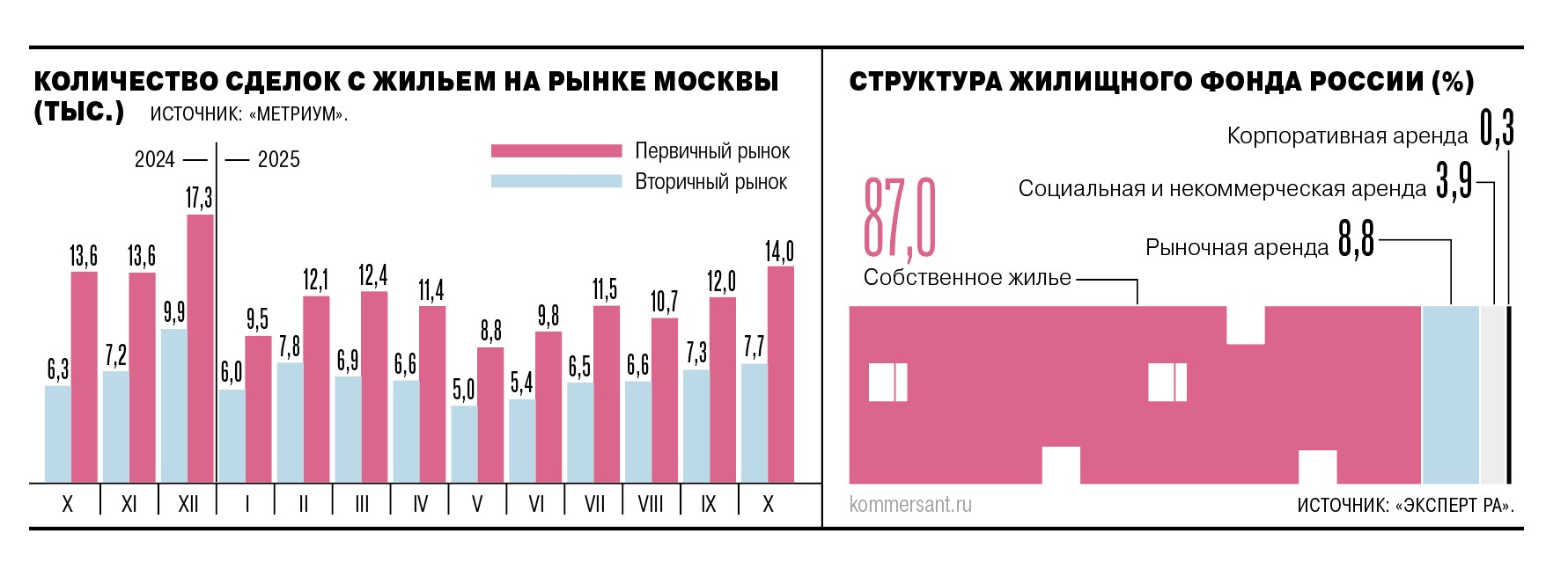 В январе—сентябре 2025 года на вторичном рынке жилья сменили собственников 1,1 млн объектов недвижимости, что на 14% меньше год к году, приводят данные в Российском союзе рынка недвижимости (СРН). При этом медианная сумма сделки выросла с 2,8 млн до 3,3 млн руб., средняя — с 4,7 млн до 5,5 млн руб. Исходя из этого, общая сумма всех сделок на «вторичке» составила около 5,4 трлн руб., уточняют аналитики ассоциации.