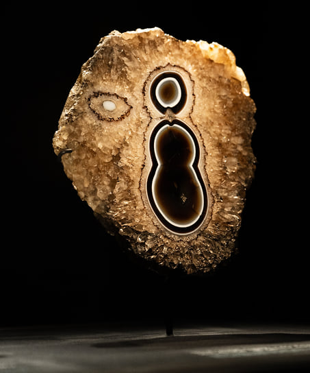 Приобретал он разновидности халцедонов (агат, оникс и яшму), а также септарии и известняки с дендритами. При этом специалисты не скрывают некоторого разочарования: Кайуа был довольно хаотичным коллекционером, выбирал импульсивно, и коллекция его неравномерна по качеству как с эстетической, так и с научной точки зрения. Однако ценность ее — в словах смотрящего. Камни открыли ему путь к новому письму, стали его молчаливыми собеседниками, будоражащими воображение. В белых ровных пятнах он видел холмы и широкие равнины. В тонких извилистых жилках — червеобразное тело, пронизанное светом. В трещинах звучал шум морских волн и горных рек, из обрывков линий складывались скалы, а чешуйки на агате извивались, словно змея. Фигуративные образы и иконические мотивы из истории живописи тоже неизменно возникали перед глазами. То спускающаяся по лестнице обнаженная Марселя Дюшана займет все каменное полотно, то птица Константина Бранкузи покорно сложит крылья. Так называемые камни с изображениями составляют важную часть коллекции. Разочаровавшись в переменчивом мире идей в современном искусстве, Роже Кайуа искал материальное подтверждение очевидному факту, что природа — лучший художник.