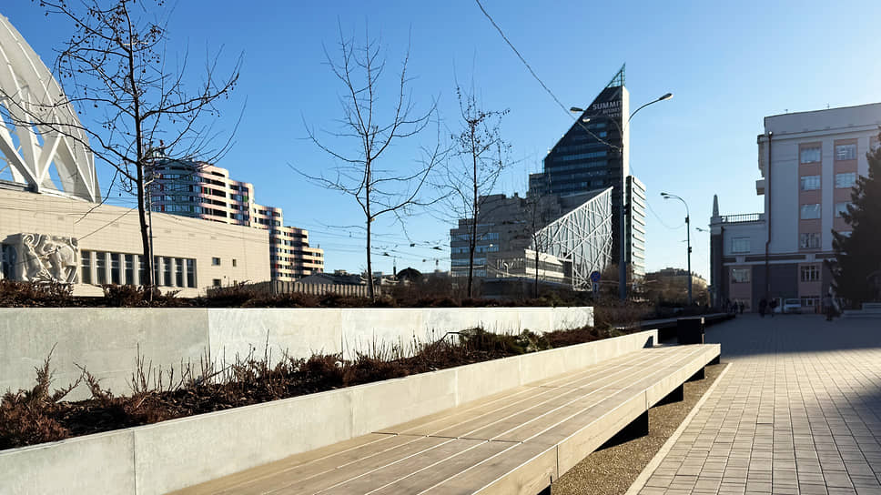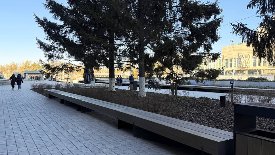 Вдоль улицы 8 Марта установили вазоны с яблонями, соснами и можжевельниками. Для растений предусмотрен автоматический полив и утепление. Перед вазонами разместили скамью длиной около 70 метров.