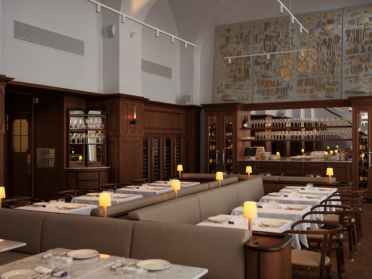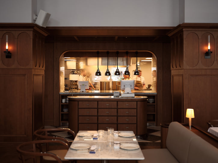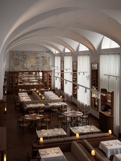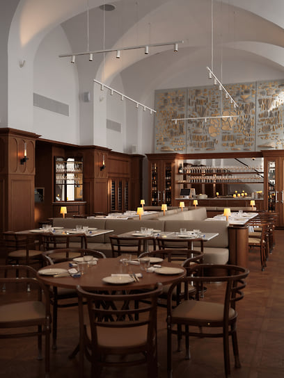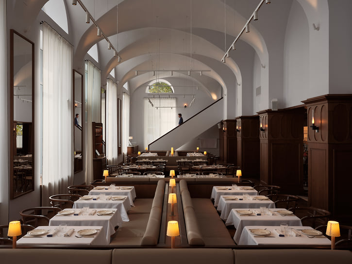 Интерьером ресторана традиционно занималось бюро Appa. Вытянутый зал с высокими сводами и симметричными рядами столов напоминает музейное пространство. Мраморные столешницы и светлая обивка создают ощущение почти лабораторной чистоты, которую смягчают теплые деревянные акценты. Панно над баром становится визуальным центром — на его фоне выстраивается строгая, отрежиссированная перспектива. «Перемена» адресована широкой аудитории, включая тех, кто ценит классику без избыточных экспериментов. На старте предлагают советский салат из трески с картофелем, огурцами и красным луком; хлеб пекут на месте. Селедку шеф подает в лаконичной авторской версии — небольшие порции с соусом тартар и маринованным луком. Форшмак здесь воздушный, смешанный с картофелем, яйцом и бородинским хлебом. Сало, нарезанное тонкими и длинными кусочками с крупными мясными прожилками, напоминает итальянскую панчетту и подается с ядреной горчицей.