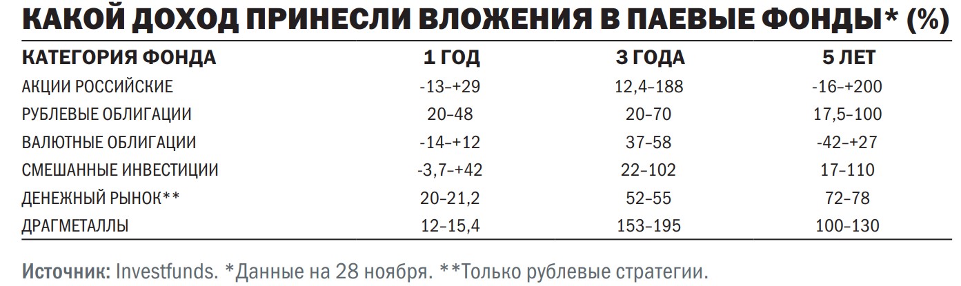 Благодаря активному управлению портфельных менеджеров лидирующие позиции по доходности заняли паевые инвестиционные фонды (ПИФы), но не все. По оценкам «Денег», основанным на данных Investfunds, за 12 месяцев, завершившихся 28 ноября, из 160 крупных розничных фондов (ОПИФы и БПИФы с объемом активов, превышающим 500 млн руб., без учета фондов с выплатой промежуточного дохода) у 134 ПИФов цена пая выросла. 115 фондов обеспечили доход выше 10%, а у 21 он составил 30–49%. В 2024 году успешных фондов было меньше: доходность выше 10% обеспечили лишь 34 фонда, а у 14 лучших она оказалась 20–56%.