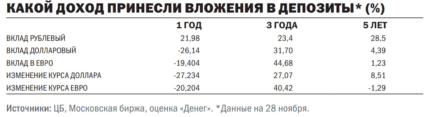 Впервые с 2022 года убыточными стали депозиты, номинированные в долларах США и евро. За год такие вложения обесценились на 26% и 19% соответственно (в 2024 году они принесли прибыль в 17% и 16%). Это худший результат за все время наблюдений «Денег».