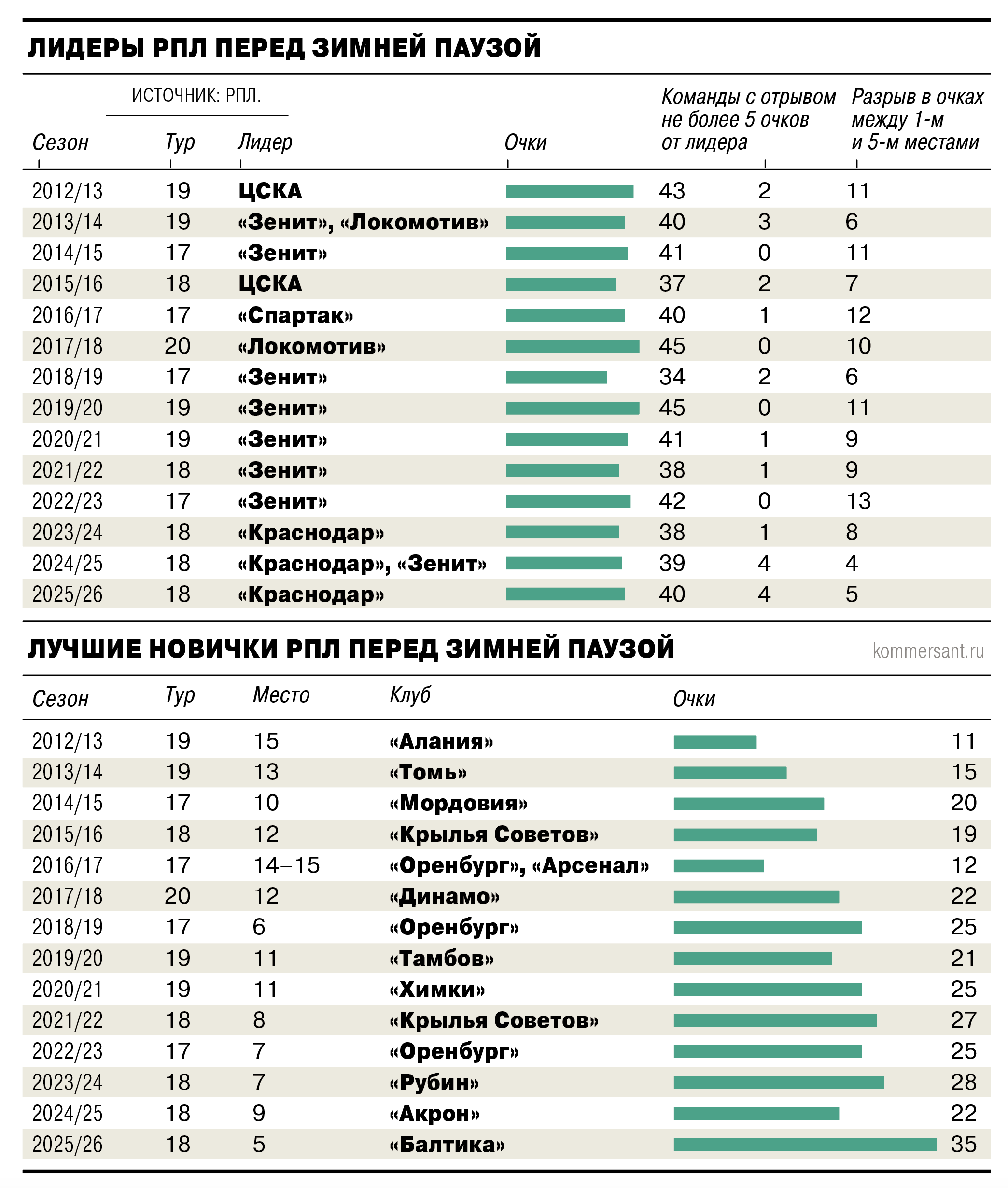 Чемпионат России по футболу, как и год назад, отправился на зимний перерыв с чрезвычайно интригующим раскладом. Между клубами, которые находятся в авангарде, символические разрывы, а лидера — «Краснодар» — от идущей пятой «Балтики», новичка высшего дивизиона, отделяют всего пять очков. В первенствах «большой европейской пятерки» плотность на верхушке турнирной таблицы гораздо ниже.