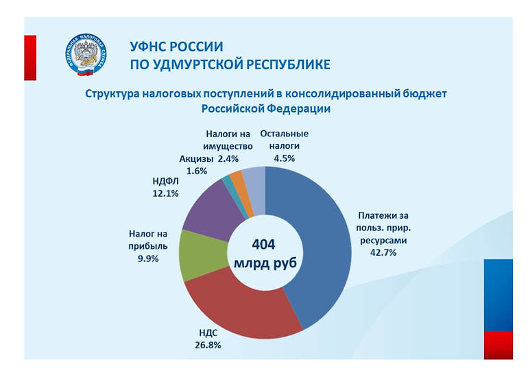 В статистике УФНС по Удмуртии отмечается, что доля взимаемых средств от добывающих компаний в консолидированном бюджете РФ уменьшилась за год с 65,8% до 49,7%. Участие обрабатывающих производств в формировании казны, напротив, увеличилось с 17,9% до 26%. Доля поступлений от субъектов малого и среднего предпринимательства по всем видам налогам на разные уровни бюджета за 10 месяцев составила 19,7%. Всего они заплатили налогов на 79,7 млрд руб., что на 46% больше, чем год назад.