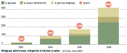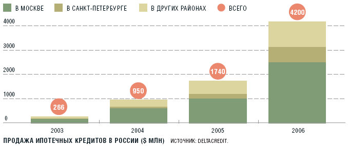 Объем ипотечных кредитов, выданных россиянам в 2006 году, составил $4,2 млрд. Что несоизмеримо с американским рынком ипотечного кредитования, на котором только общий объем просроченной задолженности достиг $1,3 трлн.