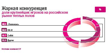 Инновации со скукиВозможно, рискованные эксперименты еще аукнутся Струпинскому. Пока же его компания – безусловный лидер в сегменте теплых полов (48% российского рынка, по собственным оценкам компании, с которыми соглашаются и конкуренты; см. график). ССТ выпускает десятки видов кабелей и термостатов, их можно использовать в разнообразных условиях: влажных помещениях, с деревянным покрытием, в условиях вечной мерзлоты и проч. Конкуренты таким многообразием похвастаться не могут, продвигая лишь определенные виды продукции.