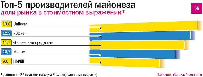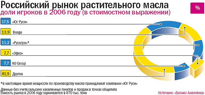 Объем производства растительного масла в России, по данным компании WJ Group, в 2006 году составил около 2,57 млн тонн — это на 16% больше по сравнению с предыдущим годом. Однако, как утверждает директор по маркетингу WJ Сергей Козлов, рост продаж бутилированного масла на территории России не превышает 3–3,5%. Дело в том, что потребление масла в течение последних двух-трех лет практически не меняется (по разным оценкам, на одного человека приходится до 12 л в год), поэтому производители масла наращивают объемы экспорта: в 2005 году из России было вывезено 316 тыс. тонн растительного масла, в 2006-м — уже 731,9 тыс. тонн. Другой канал сбыта — динамично развивающиеся пищевые отрасли, использующие при изготовлении продукции растительные масла: например, производство майонеза, которое последние годы растет примерно на 20% в год. Индустрия подсолнечного масла находится в стадии консолидации — под контролем пятерки лидеров 58,1% рынка. Эксперты прогнозируют, что к середине 2007 года на нем останется лишь пять-шесть крупных производителей, имеющих федеральные марки.