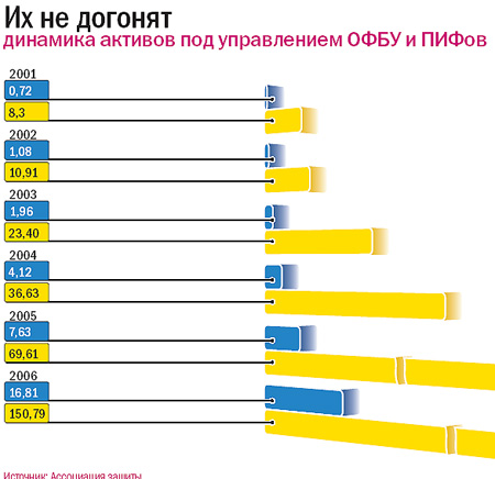 На свет ОФБУ и ПИФы появились практически одновременно. В 1996 году были выданы лицензии первым паевым фондам: они оказались подотчетны Федеральной комиссии по ценным бумагам (ныне Федеральная служба по финансовым рынкам). Такое решение пришлось не по вкусу другому, более влиятельному в те годы регулятору — Центральному банку, имевшему собственные амбиции на рынке ценных бумаг. Через год ЦБ успешно лоббировал создание альтернативного инструмента коллективных инвестиций — ОФБУ, аналога которому, как уверяют в АЗИПИ, на мировом рынке не существует.