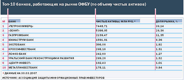 «Маршрутки» хотя и рапортуют о двукратном росте своих активов, однако сами признают: дело отнюдь не в сумасшедшей популярности, просто расти почти с нуля всегда легко. Тем временем «автобусный парк» расширяется год от года: только в открытых и интервальных ПИФах сейчас находится около 180 млрд руб.,— почти в десять раз больше, чем в ОФБУ. Несопоставимо и число «водителей»: если управляющих компаний на рынке коллективных инвестиций, по данным Investfunds, насчитывается 342, то банков, активно работающих с ОФБУ, чуть больше 30. При этом серьезными объемами средств оперируют лишь три-четыре крупнейших игрока: на долю «Петрокоммерца», «Зенита», Газпромбанка и Юниаструм банка, по данным Ассоциации защиты информационных прав инвесторов (АЗИПИ), в первом квартале 2007 года пришлось свыше 87% всех сборов.