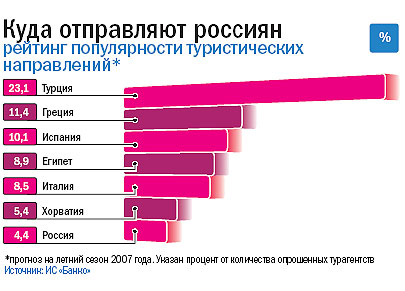 Правда, как показывают опросы ВЦИОМ, на сегодняшний день отдых за границей могут позволить себе не более 4% россиян. Для сравнения: семь из 10 жителей Нидерландов и более половины граждан Германии как минимум раз в год проводят отпуск за рубежом. А рост цен обусловлен не столько повышенным спросом на услуги туроператоров, сколько увеличением стоимости авиабилетов: по данным брокерского дома «Открытие», только в течение 2006 года авиатопливо подорожало на 20%.