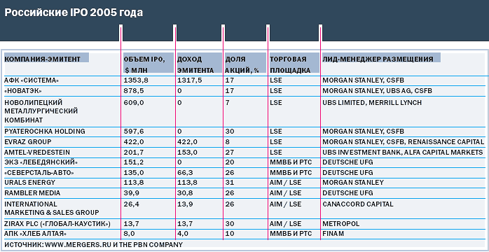 В итоге, по словам Юрия Игнатишина, управляющего директора информационного агентства M&A, объем российского рынка IPO составил $4,55 млрд (по сравнению с $620 млн в 2004 году). При этом 94% стоимостного объема рынка (10 из 13 размещений) приходятся на Лондонскую биржу. И это еще одна отчетливая тенденция года. Ведь в 2004 году на российский фондовый рынок пришлось 53%, на NYSE – 47% от суммы размещений. В 2005 году на NYSE не пошла ни одна российская компания: драконовский закон Сарбейнса–Оксли, из-за которого жизнь на американской бирже стала значительно дороже, сделал свое дело.