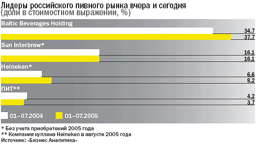 Желание «просто быть» реализовалось в том, что летом этого года Heineken приобрел сразу четыре российских пивоваренных компании (последняя покупка – холдинг «Пивоварни Ивана Таранова», или ПИТ). Каждую покупку концерн сопровождал победным пресс-релизом об очередном укреплении позиций. Присоединив ПИТ, Heineken прочно занял третье место на рынке, тогда как еще в 2003 году удерживал шестое. Этот прыжок вверх обошелся голландцам, по подсчетам СФ, не менее чем в $650 млн (не учитывая покупку самого первого завода).