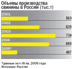 По итогам 2005 года объем инвестиций в свиноводство превысил $1 млрд. Столь активные действия в этом сегменте обусловлены в первую очередь активной поддержкой государства. Внутренний рынок свинины с 2003 года защищен от импорта квотами, а в декабре 2005-го их действие было продлено до 2009 года. Дополнительным стимулом для российских производителей является еще и подпитка со стороны Минсельхоза. Как известно, министерство субсидирует до двух третей процентной ставки по банковским кредитам для производителей мяса.