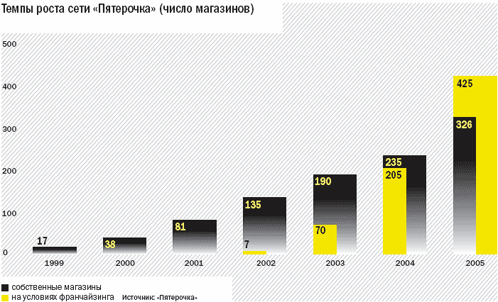 И сейчас представителей «Пятерочки» пессимизм аналитиков и конкурентов не смущает. Неслучайно компания, хоть это и не афишируется, одновременно с выкупом старых франчайзи продолжает обзаводиться новыми. В прошлом году она продала франшизу в Красноярск, Белгород, Вологду и Нижний Новгород. План на этот год такой же: около пяти новых договоров. «Мы не строим нереальных планов,– говорит главный исполнительный директор «Пятерочки» Олег Высоцкий.– У нас в 2005 году только франчайзинговые магазины сделали оборот около $900 млн. С учетом всех будущих магазинов и сети „Карусель” наша цель вполне достижима».