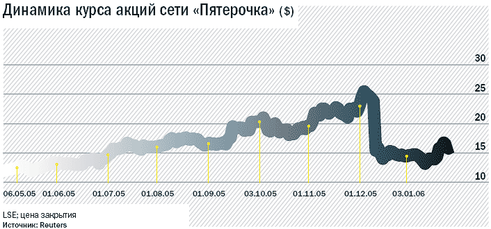 Конец прошлого года стал наиболее мрачным периодом в истории крупнейшего российского ритейлера. После того как в середине декабря «Пятерочка» сообщила, что понижает прогноз собственной выручки за 2005 год на $250 млн (с $1,55 млрд до $1,3 млрд), ее GDR на Лондонской бирже за один день подешевели на 36%. Это падение оказалось самым значительным за все время присутствия наших компаний на западных фондовых площадках.