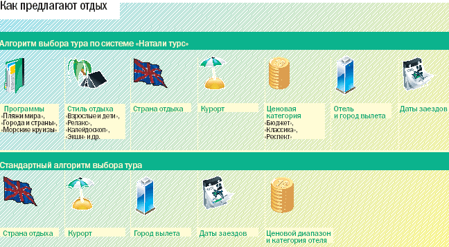 Чтобы избежать накладок и сделать для туриста выбор более осознанным, в начале летнего сезона 2006 года «Натали турс» решилась на маленькую революцию. Менеджеры попробовали отложить каталоги с бесконечными одинаково красочными отелями и взялись продавать линейку «упакованных» туров. Компания не отказалась от традиционной схемы работы, но к концу 2006 года предполагает довести долю готовых туров в общем числе продаж до 30% (сколько «Натали турс» зарабатывает на новой системе сейчас, в компании не раскрывают).