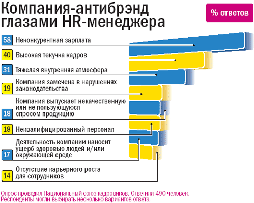 Наиболее продвинутые компании чувствуют себя товаром, который должен понравиться покупателю (потенциальным сотрудникам). Для этого они предпринимают серьезные маркетинговые усилия (см. СФ № 17/2006). Но, к сожалению, подобных компаний в нашей стране не так уж много – на кадровом рынке стало появляться все больше «антибрэндов». «На наш взгляд, их появление – новый виток в рыночных отношениях,– рассуждает председатель Национального союза кадровиков Софья Данилкина.– Он свидетельствует о том, что работники сегодня способны всесторонне оценить работодателя – уровень менеджмента, социальный пакет, возможность развития своего профессионального потенциала и так далее».