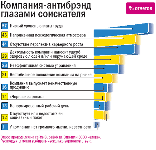 Пожалуй, нет ничего удивительного в том, что все наши респонденты (кадровики и соискатели) в качестве первого признака антибрэнда назвали материальные факторы: явный и ничем не мотивированный разрыв в зарплате с другими компаниями воспринимается однозначно негативно. Именно из-за низких зарплат, а также перебоев с их выплатой многие компании попали в антибрэнды. Кстати, «черная» зарплата волнует людей в меньшей степени: главное, чтобы устраивал ее размер. Кроме того, кадровики и соискатели отмечали плохие условия труда некоторых антибрэндов – холодное помещение, недостаточная оснащенность компьютерной техникой, телефонными линиями и т. п.
