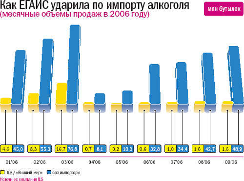 Но и это не стало последним злоключением «Винного мира». Новый порядок учета алкогольной продукции, вступивший в силу с апреля 2006 года, заморозил практически весь импорт напитков. По данным Национальной алкогольной ассоциации, ввоз алкогольной продукции на март 2006-го составил 76,8 млн бутылок, к апрелю он упал до 8,1 млн. Проблема заключалась в ЕГАИС – электронной системе учета алкогольной продукции. Она функционировала со сбоями, к тому же импортеры вовремя не получили акцизные марки, из-за чего не могли регистрировать продажи товара в электронной базе данных и, следовательно, реализовывать его на территории России. «Винный мир» не обошла общая участь. Если в марте поставки холдинга составили 16,7 млн бутылок, то в апреле – всего 0,7 млн (см. график.