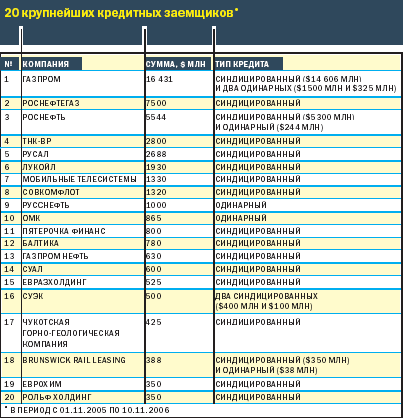 Важнейшие сделки такие. Для покупки «Сибнефти» банковские синдикаты выдали «Газпрому» гигантский кредит на $13 млрд, профинансировали приобретение ЛУКОЙЛом компании Nelson Resources ($1,93 млрд) и предоставили «Роснефтегазу» кредит в $7,5 млрд для приобретения 10,74% акций «Газпрома». Синдицированной ссудой в $800 млн было оплачено слияние «Пятерочки» и «Перекрестка». На консолидацию активов получила синдицированный кредит в $780 млн пивоваренная компания «Балтика» – рекордная сумма для отечественной пивной отрасли. «Евразхолдинг» ($525 млн) и Челябинский цинковый завод ($139 млн) тоже приобрели новые активы на деньги синдикатов.