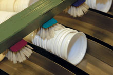 Принцип мясорубки Сырье доставляется на производство в виде гранул. Они подаются в плоскощелевой экструдер – машину, где получается расплав, который перемешивается с помощью шнекового пресса (как в мясорубке). Затем выдавленную через плоскую щель массу с помощью больших валов (каландров – похожий принцип применялся на советских стиральных машинах) превращают в лист, толщина которого может быть от долей миллиметра до нескольких миллиметров. Требования к валам-каландрам жесткие: их биение не должно превышать нескольких микрон, и с высокой степенью точности должна регулироваться температура (особенно капризен полипропилен, поэтому производительность одной и той же машины на полипропилене на 20% ниже, чем на полистироле). На специальных экструдерах можно получать многослойный лист. Одно из главных требований: его толщина должна быть равномерной. Разнотолщинность – плюс-минус 20% (что типично для азиатского оборудования) – увеличивает расход сырья примерно на те же 20%; к тому же ухудшается качество изделий. Затем лист поступает в вакуум-формовочную машину. С помощью пресс-форм получают стаканчик или тарелку, которые здесь же или чуть позже вырубаются из листа. Переход на новое изделие осуществляется после изготовления или покупки соответствующей пресс-формы. Требования к ней очень высоки, ведь каждые несколько секунд она механически смыкается и размыкается, испытывая ударную нагрузку. Даже незначительные дефекты сразу дают о себе знать. Качество отечественных пресс-форм пока не слишком высокое. Кроме производительности при покупке оборудования важно оценить длительность возможных простоев. За один день простоя, по словам господина Боловинцева, только на производстве листа теряется около $400. Законодателями мод в производстве оборудования являются немецкие и австрийские фирмы. В России часто встречается и азиатская техника – из Тайваня и Кореи.