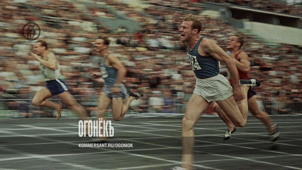 Тройной подход к тройному прыжку. Слева направо: тренер Николай Озолин, спортсмен Леонид Щербаков и исследователь техники тройного прыжка с разбега Арсений Стукалов изучают "кинограмму" прыжка, который только что совершил Леонид ("Огонек" N 18 за 1952 год). Это трио защитило диссертацию об этом виде спорта и разработало новую технику тройного прыжка.