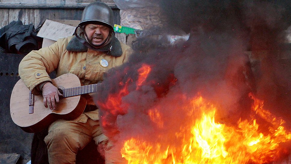Протестующий у баррикад на улице Грушевского в Киеве