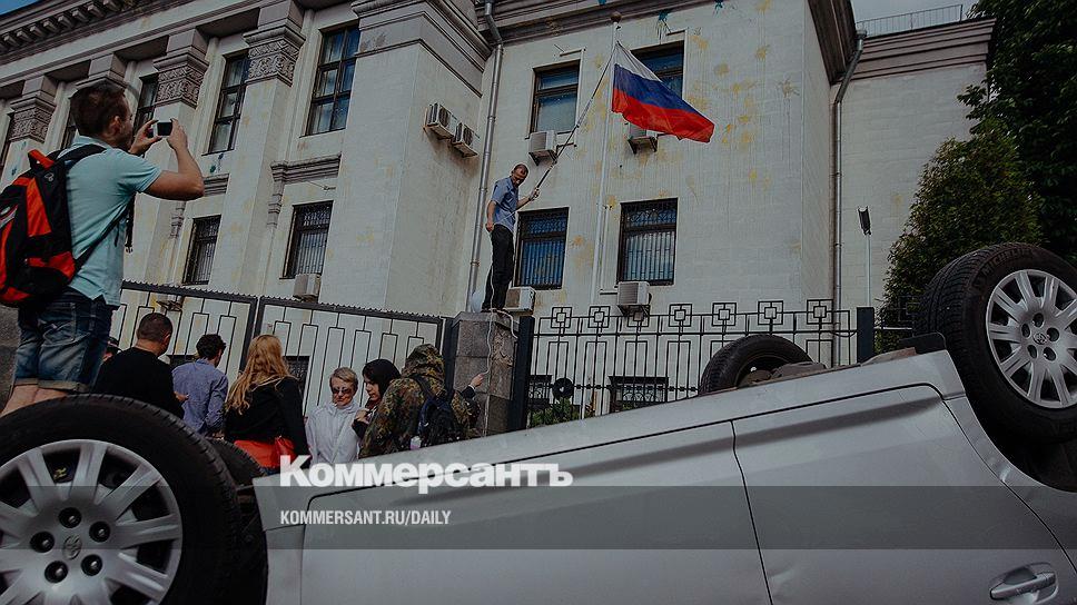 На территорию посольства РФ в Киеве демонстранты не вошли, но со здания стянули российский флаг — удочкой с крючком