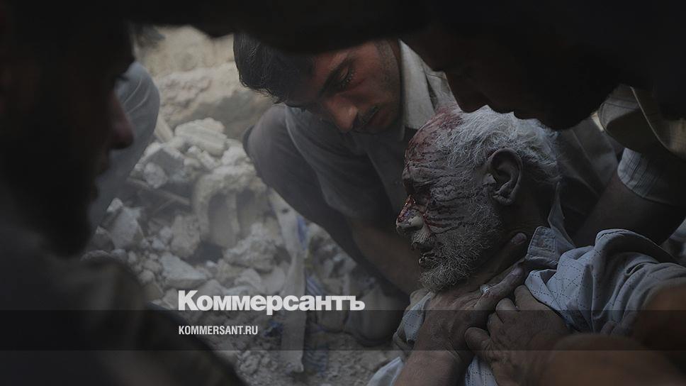 Местные жители вытаскивают пострадавшего из-под завалов разрушенного авиаударом дома в Думе, Сирия
