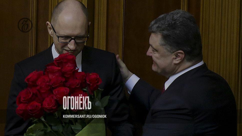Новая традиция — дарить мужчинам цветы. Премьер-министр Украины Арсений Яценюк (слева) и президент Украины Петр Порошенко на первом заседании новоизбранной Верховной рады Украины