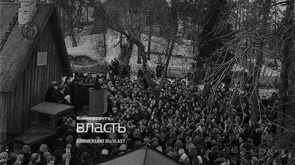 О двух месяцах, проведенных Лениным в Разливе, Н. А. Емельянов (слева) и его коллеги по музею без устали рассказывали не один десяток лет